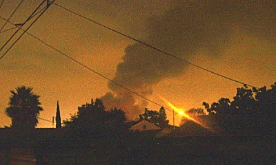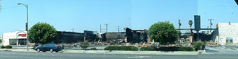 I kept hearing sirens outside last night. It was about 11:00pm. They were coming from all directions and sounded pretty close. I peeked out the kitchen window and noticed the column of smoke. I walked to the end of the block and tried to make out where it was coming from. It seemed like it was the commercial corridor along a busy street several blocks north. I was hoping it wasn't someone's home. I went out into the backyard and snapped several pictures of the column of smoke. I could see the glow of the fire and see embers rising in the air. I kept hearing popping noises too. I don't know if it was the windows or what. Next morning, I drove up Rosecrans and saw where the fire had been. It looks like the firemen managed to save the Kragen Auto Parts, which is good. That would be full of chemicals and stuff you wouldn't want burning. And, the Payless Supermarket made it through unscathed. That may be due to the buffer between it and the fire. The buffer being the "vault" part of the Bank of America. You can see the ATM machines in the stone facade. However, the lobby part was gutted. There was a Radio Shack, a 98 cent type store and some other small shops. I don't really remember what else was there. I am hoping to get more information about this. I am curious as to whether it may have been arson.