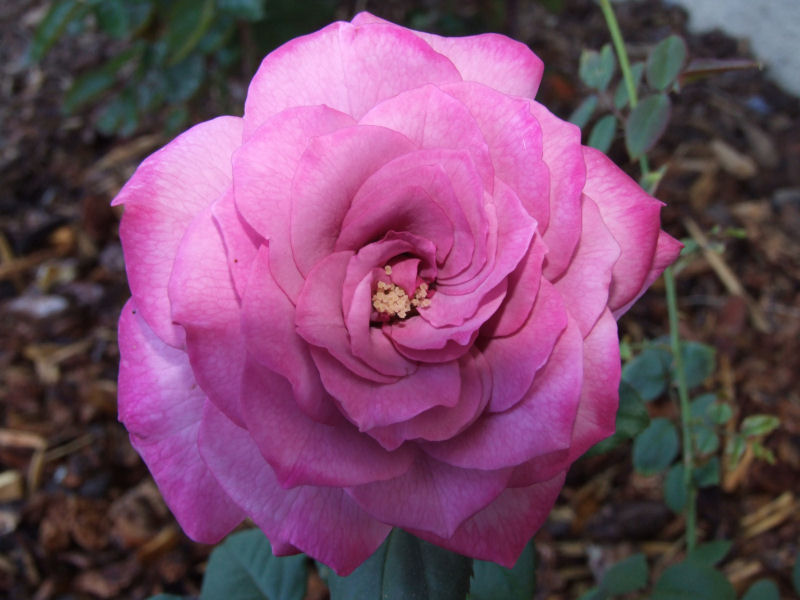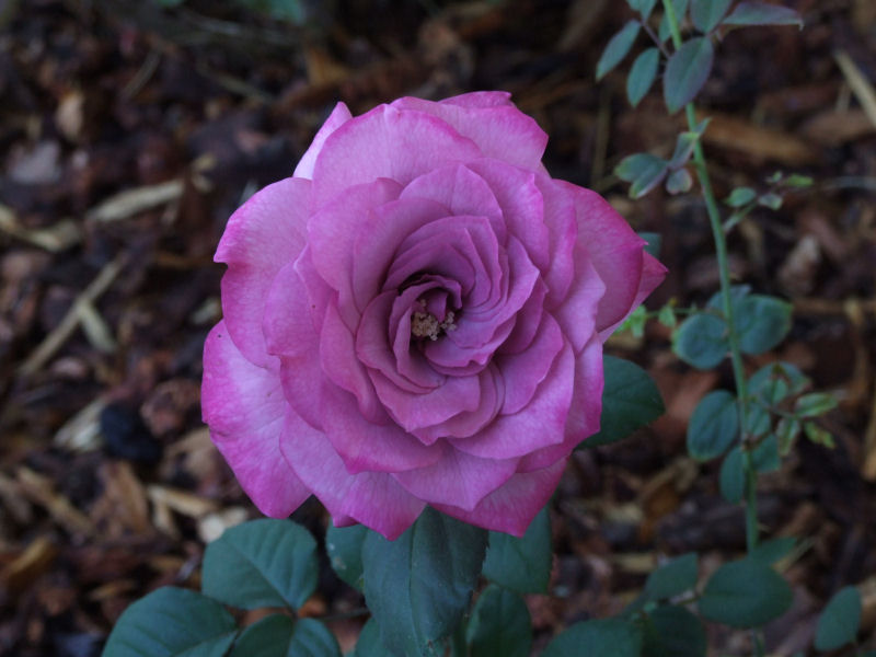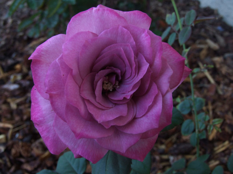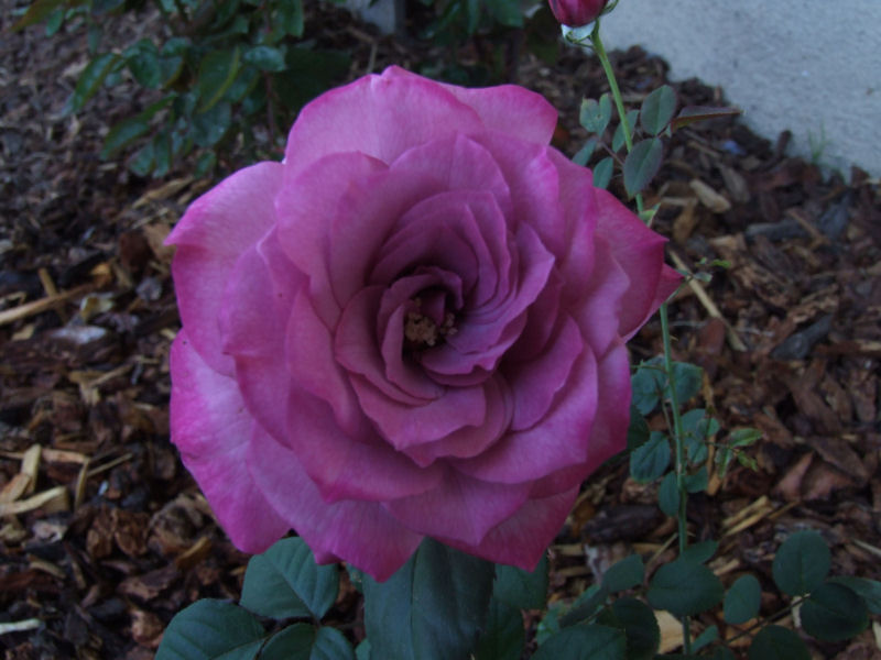 A couple of reasons why I took these. I wanted to take pictures using the different settings on the Fuji. Flash, existing light, macro, auto mode and manual. This is the first rose to grow after a major butchering. I love roses. They are so tough. A couple of weeks ago, the rose bushes were stunted, dying and covered with wilted blooms. The rose garden itself was weed choked and I couldn't see some of the smaller bushes. So, I yanked weeds, cut back the bushes till the canes were a couple of inches long and then laid down some new redwood bark. Now the bushes are coming back stronger than ever. Miracle-Gro helps.
