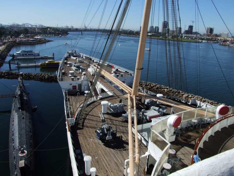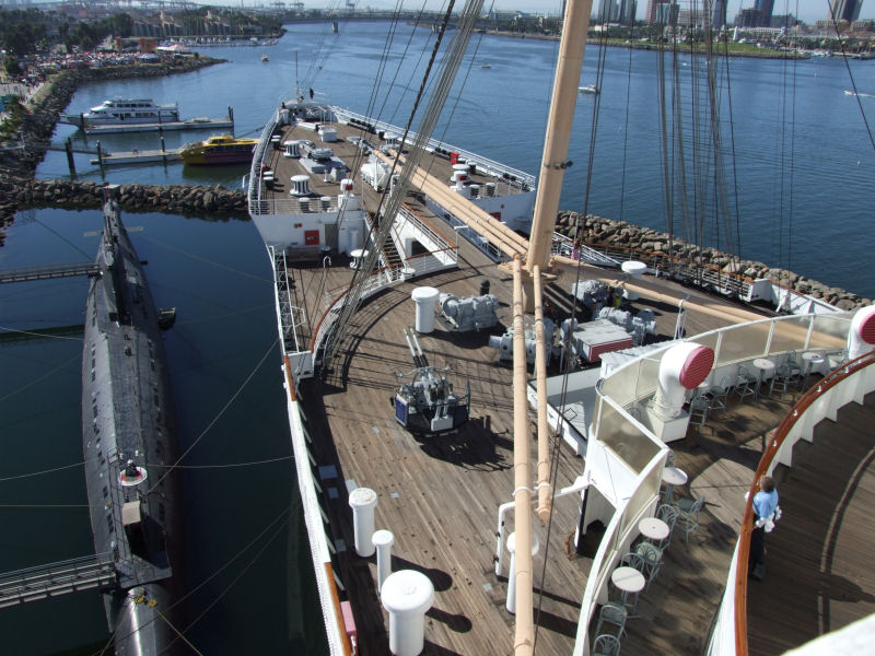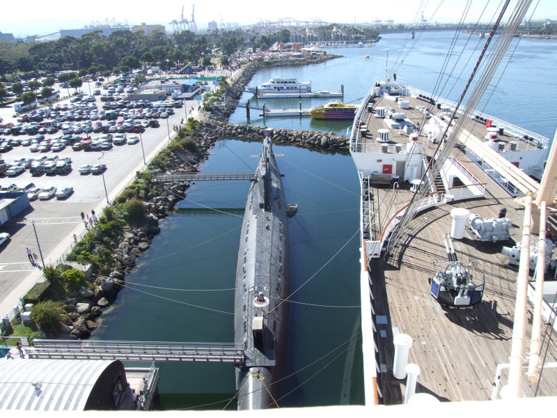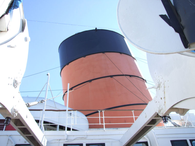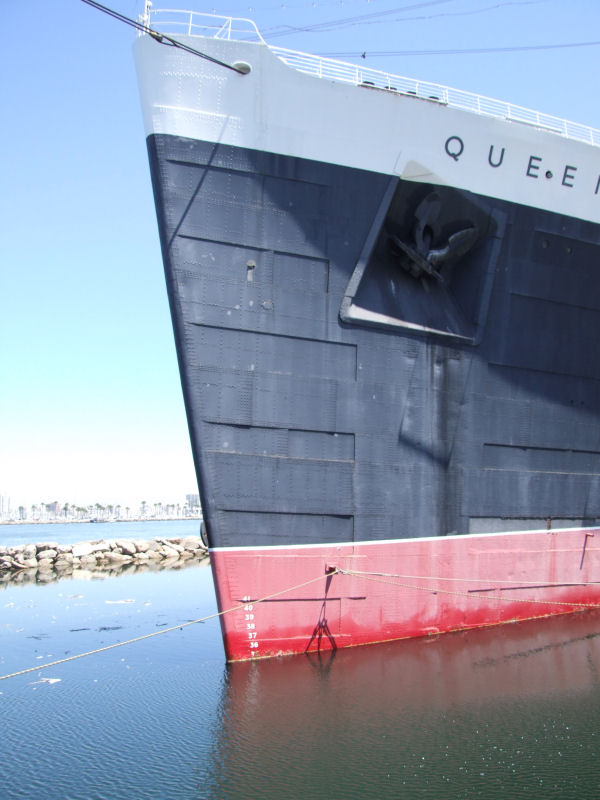 The Queen Mary that is. I had read that Titanic: The Artifact Exhibition, would be making a stop at the Queen Mary. She's located down in Long Beach. Which isn't too far from where we live. Since I'm into all things Titanic, I wanted to catch it before it moved on to San Francisco. I finally managed to make the time to see it yesterday, Sunday the 27th. Which is a good thing, since it's last day here is September 4th. Unfortunately, I was unable to take any pictures while touring the display. None at all. That was their policy. No photography, videotaping, not even cellphone cameras. But, I did manage to take some of the Queen Mary and the Foxtrot- Class Russian submarine, codenamed Scorpion, that is tied up next to her. We also toured the sub. We also were able to take a self guided tour of the Queen Mary. But, I really wanted to see the Titanic display the most. They gave us each a "boarding pass" for the Titanic, that had a person's name on it. At the end of the tour, they had the names of the survivors, and the deceased on a wall and you were able to look up the person's name to see it they survived. My "person" didn't. They were a third class passenger. While I loved the tour and seeing the artifacts, the whole story made me depressed. What a waste.