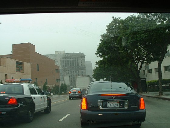 So, I was hoping to get some nice images of the downtown skyline, but it was too hazy. I could hardly see the buildings. I did get this one of the street in front of the courthouse. (Notice the plate on the Cadillac in front of me? It's a lawyer.) Right when I snapped, an LAPD car drove by: