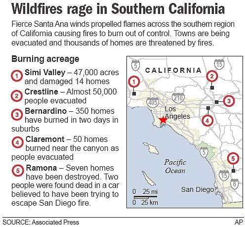 Today, a firefighter died fighting one of the many blazes here in California. The toll so far: 10 fires burn in an arc that stretched from Ventura County down into Mexico. The cost so far? More than 2400 homes burned with estimated losses exceeding 2 billions dollars. Overall, the fires have burned over 634,000 acres, more than twice the size of the city of Los Angeles. Arson is suspected in 4 of the fires. I hope they catch those assholes.