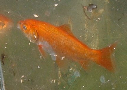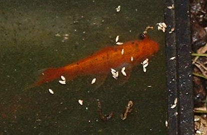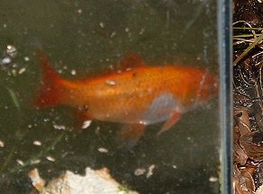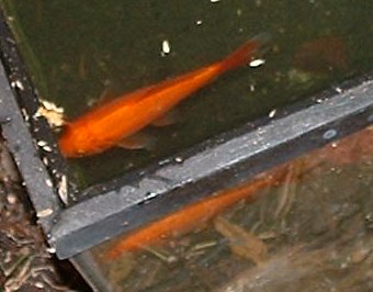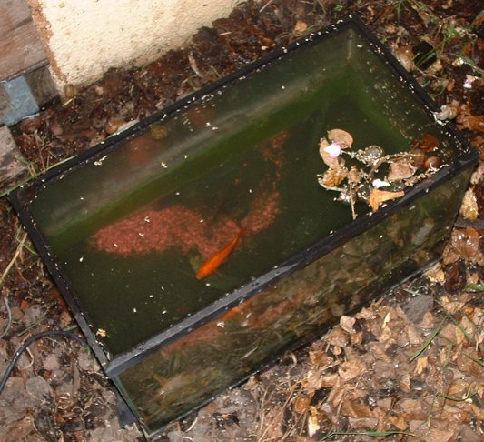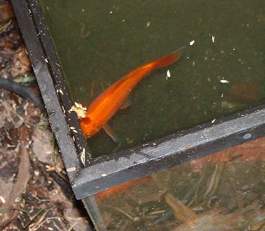 About 8 years ago, our oldest daughter, Helena, acquired an "ecosystem" in a tank. A good friend of hers, was moving away. She gave Helena the "ecosystem" before she moved. She had it going in a five gallon bucket. Basically, you put rocks, in the bottom, fill it with water, drop in an old branch and put in a fish. It's totally self supporting. You never have to feed the fish, or clean it. When Helena got it, we put everything into a ten gallon fish tank and placed it in the rose garden. Occasionally, when we noticed that it was down to one fish, we would go to the local fish store and buy about 15 small goldfish and drop them in. Over the years, some of them would actually breed. I don't know the last time we bought any goldfish and dropped them in there. However, I had been neglecting the rose garden these past few months. The roses were tall and scraggly, and the whole garden was weed choked. I went through, pruned roses, and pulled weeds. Finally, I uncovered the tank. Only to see that it had about 3 inches of water in it. The water itself was dark green and looked about the consistency of syrup. Nothing could live in that, I thought. However, I saw a flash of orange. Whoa! I grabbed the hose to fill it, and let the water overflow, to clean it out a bit. When the water was almost clear, I could see that there was one fish left, and he was huge! I named him Fishzilla.