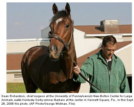 "We will continue to treat Barbaro aggressively as long as he remains bright, alert and eating," Dr. Dean Richardson, chief surgeon at the University of Pennsylvania's New Bolton Center in Kennett Square, Pa., said Sunday. "This is another significant setback that exemplifies how complex his medical situation remains because both hind limbs have major problems."