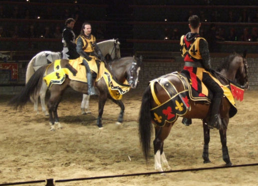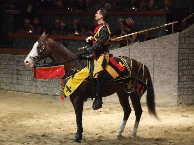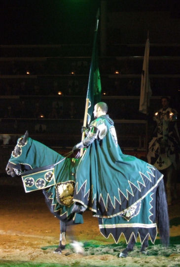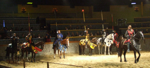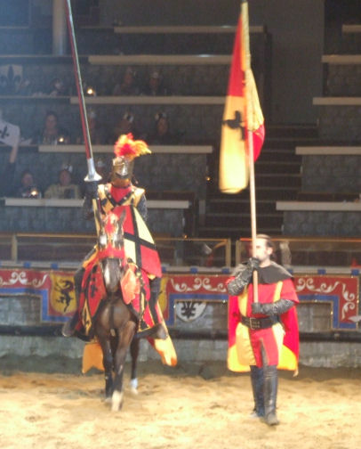 As I mentioned here, I bought tickets online to Medieval Times. We went on Thursday, January 11th. We had a blast. Basically, you are seated around an arena. You are given cardboard crowns that match the color of your knight. You cheer him on as he participates in games of skill and jousting. There is also a background story that is told in the beginning. Your feast starts out with soup. You drink it out of the bowl, there are no utensils. Along with the soup you are given garlic bread After the soup, there is a roasted half chicken, one pork sparerib, a half of a baked potato and a pastry for dessert. Remember, there are no utensils, so you eat everything by hand. It was really delicious. Much better than what I thought it would be. Here are some pictures. Our knight is the one wearing red and yellow: