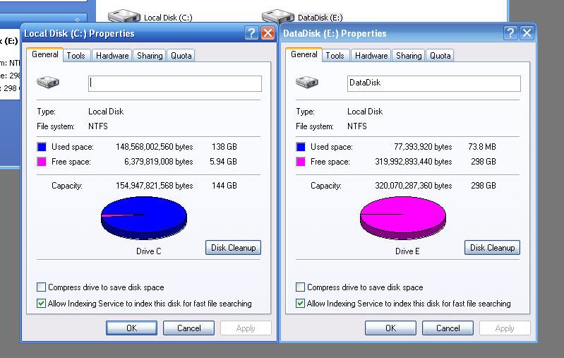 The one on the left is the drive that came with my new Dell. The pink is the available space. The blue is what's been used. As you can see, I didn't have any room. Mike added another drive. I've been cleaning out a lot of files before I move them to the new drive. A lot of the C: drive is taken up with TV shows I've been recording to the disc. Veronica Mars and Ugly Betty. I need to go through those, edit out the commercials and burn them to a disc. That will free up a ton of space.