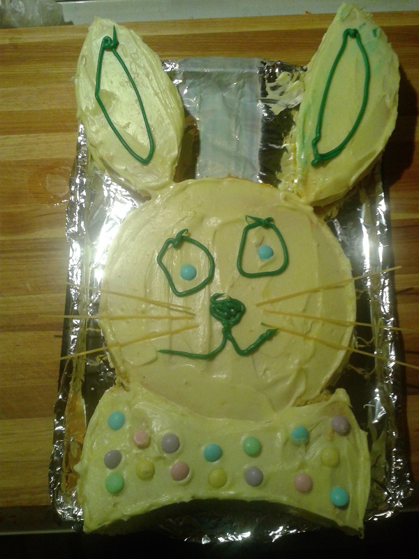 I used to make a bunny cake every Easter years ago. Since I started working, it's been a little harder to find the time. Amanda used to go to work on Sunday, and I would go with her to help her so she could leave earlier. Kelly is giving Amanda Easter off now, so I had all day today to cook and clean. So, I made the bunny cake. It's real easy. You make two round cake layers. One layer is the face, and you cut the ears and bow tie out of the other layer with two cuts. You can decorate it anyway you want. I sometimes use colored frosting to make the face, dry spaghetti for whiskers and pink coconut to make the inside of the ears pink. But, since I couldn't find any of those things, I just used plain M&M's to make the facial features. I hope everyone had a nice Easter.