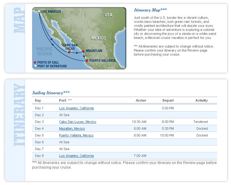 Several years ago, a friend of ours went on a cruise. He raved and raved about how the crew of the ship fawn all over the passengers. He made it sound like every passenger would have 5 people following them around constantly. Fussing over them and catering to their every whim. It really didn't sound that appealing to Mike and I. We were/are into dirt camping and the thought of being pampered constantly, by people who had their hands out for tips didn't sound very fun. Flash forward to a couple of years ago. My parents, and one of my sisters had started to go on cruises. I asked about this phony fawning over they were taken aback. I know my Mom and she wouldn't enjoy something like that. She said it wasn't like that at all. In fact, she, my dad and sister loved going on cruises. So, for out 20th anniversary, Mike and I decided to go on a short cruise to see if it was our cup of tea. We loved it. We are now hooked. Since we took the one cruise, we our on the mailing list of every freaking cruise line out there. And, we want to go on every one that comes our way. We decided that in October of 2008, we are going to take the cruise above to the Mexican Riviera. After that, at some point, we will go to Alaska. If we had Bill Gates money, we would probably spend the rest of our lives cruising. Or cruise until we get absolutely, positively sick of it.