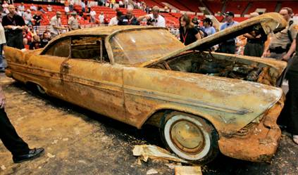Their fears were confirmed Friday evening at the Tulsa Convention Center, when organizers lifted a curtain: The car's rear end was dragging the ground, and its once-glossy finish was encrusted with barnacles of oxidation. The upholstery was eaten away, and only the metal base of the seats remained. The engine was crumbling, but a member of Coddington's crew was able to take out the dipstick, drawing a cheer from the crowd.
