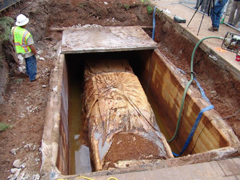 Alas, the concrete block was not so impregnable. When Hazmat crews cracked it open Wednesday, they discovered nearly 2,000 gallons of standing water. Devastated, Sharon King Davis, Tulsarama's chief organizer, cried on the spot.