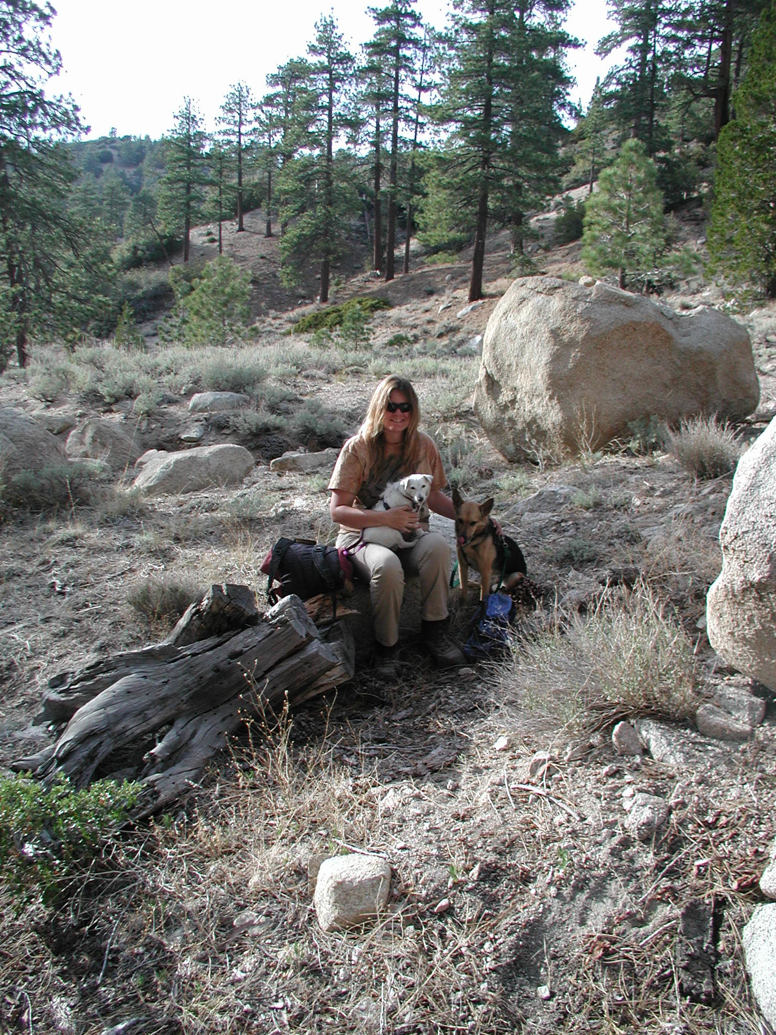 One of the benefits of living in Southern California. The Pacific Ocean is 6 miles to the west. The Angeles Crest National Forest is about an hours drive away, if that much. My sister and I went on a hike yesterday. It was supposed to be a 7 mile round trip, but we got started too late. We only made it about 2 miles in when we realized that we needed to get back, or we would be going down a 26 mile switchback road in the dark. Anyway, we stopped for a snack break and she took this picture of me. The dog on my lap is Violet, our Jack Russell Terrier. The dog sitting next to me is Pepper, our Whippet/Shepherd mix. Click the image if you want to see the full size picture.