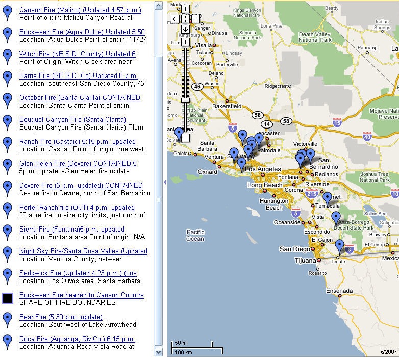 Hot dry winds, lack of rain make for perfect fire conditions. And, we weren't disappointed. There seem to be fires everywhere. There we are, in Los Angeles. We're not in any danger. There is smoke in the air and ash falling. There have been some injuries and structure losses. I hope the weather changes and the fire fighters can knock these down.