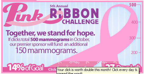 In the fight against breast cancer. You can go to The Breast Cancer Site every day and "click" to give free mammograms. The link will take you right to the page. They have a Pink Ribbon Challenge going on for the month of October. If they can get enough clicks to total 500 mammograms, their premier sponsor will fund an additional 150.