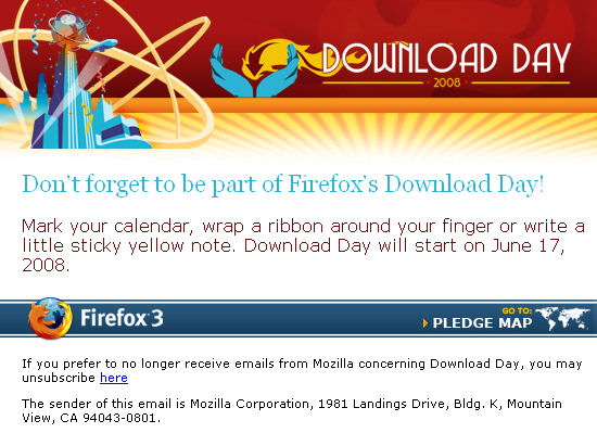 Got an e-mail today from Mozilla. The official FireFox 3 download day is going to be Tuesday, June 17th, 2008. I'll be there.