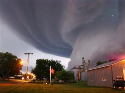 A huge tornado funnel cloud touches down in Orchard, Iowa, Tuesday at 9:04 p.m. The Globe Gazette and Mitchell County Press News reported that Lori Mehmen of Orchard, took the photo from outside her front door.