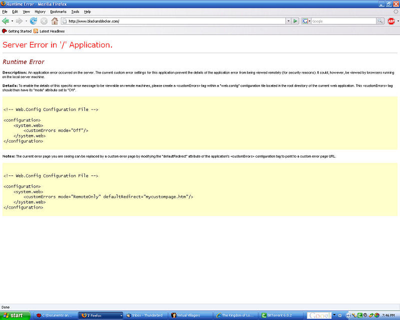 I must have a magic keyboard that kills websites. I posted about us buying a Black and Decker Grasshog to replace our dying weed whacker. Turns out there's something wrong with it. The cutting line is not "feeding" out. Since I had registered it over on blackanddecker.com, I went over to the website to see if I could e-mail customer service. It asked for my user name and password. I put in the right password, but it kept rejecting it. I checked the caps key. That wasn't the problem. So, I asked to have my password sent to me. Sure enough, I was using the right password. So, I went back to the site, put in my user name and password and get what you see in the first image. Yes, I seemed to have killed the site. I assume it's back up and working now. Haven't been back to check.
