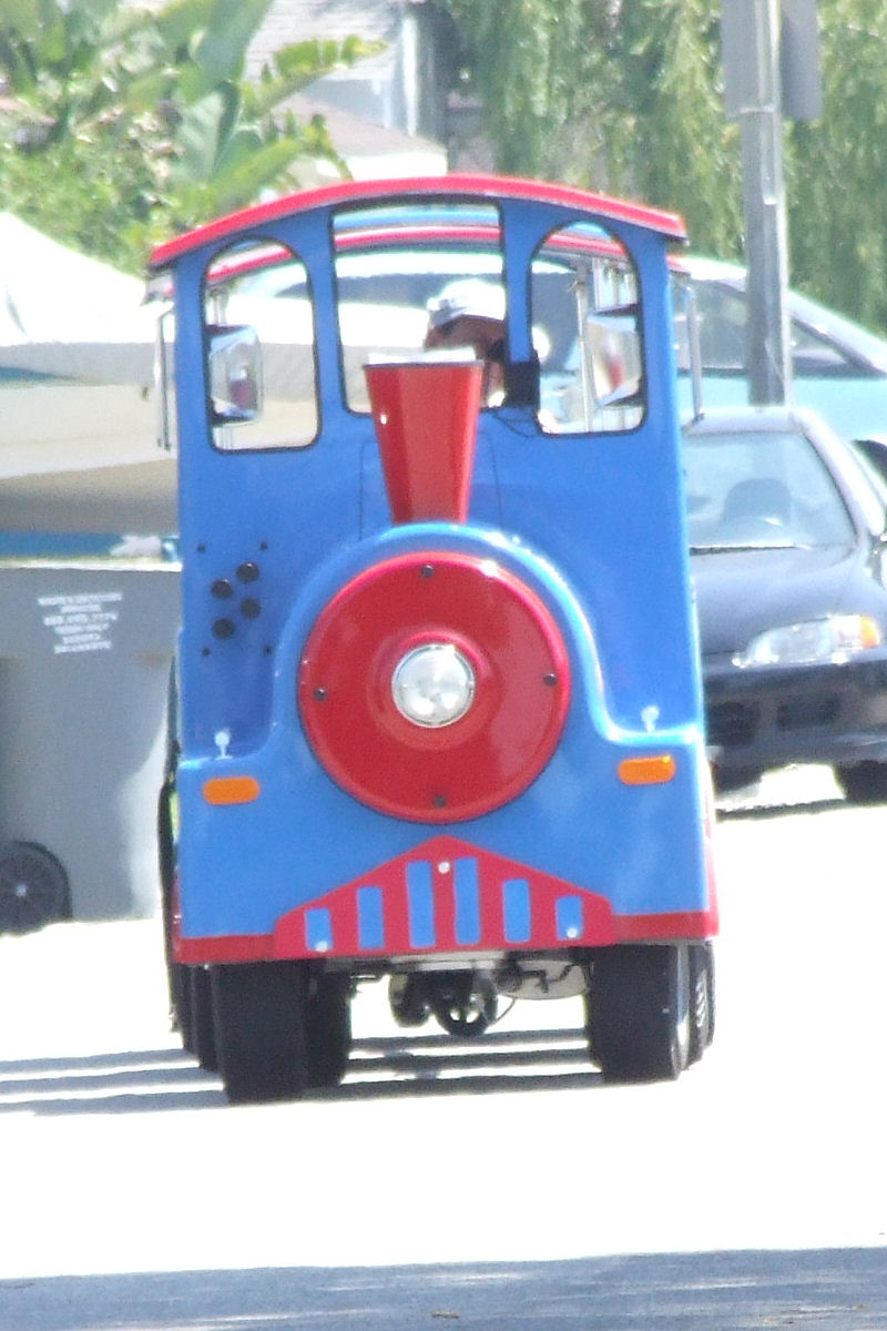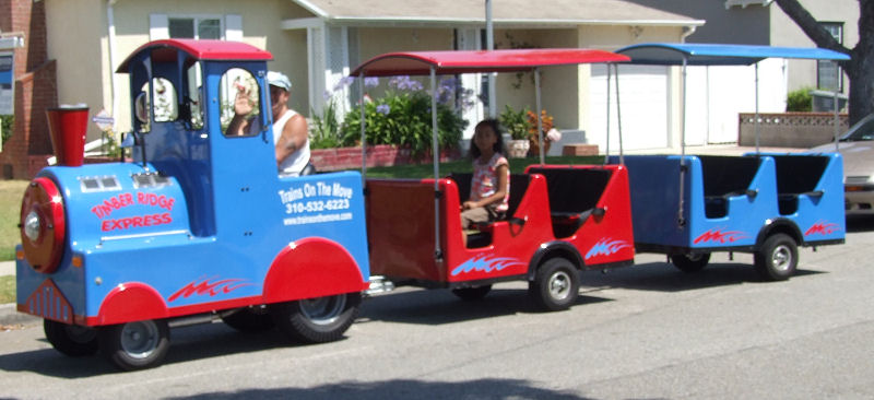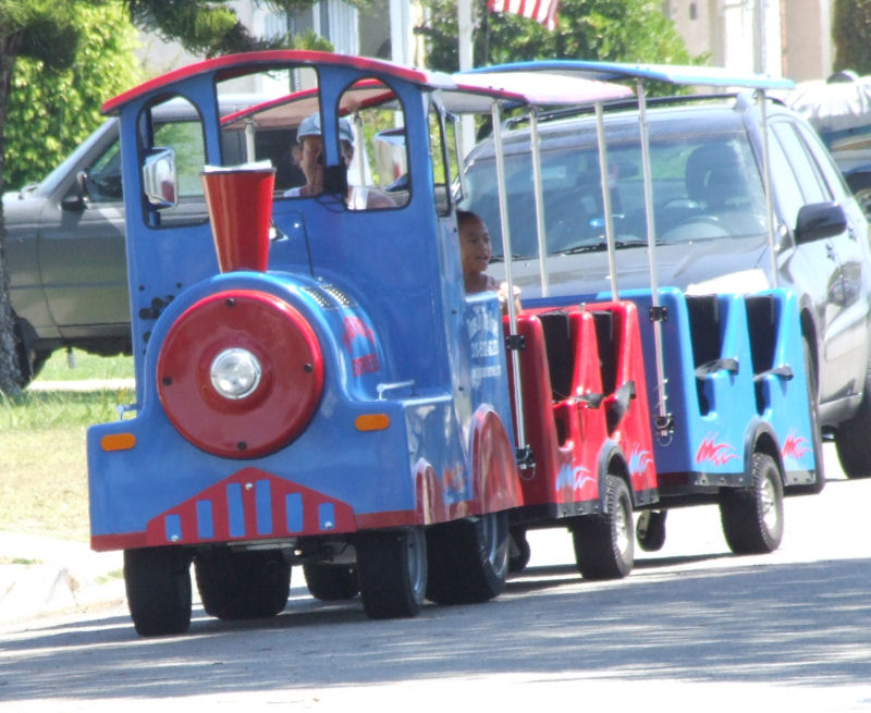 Decades ago, one of the more over-indulgent families, on our block hired a pony cart for their daughter's Birthday party. This was rather lavish, considering that most parties, at that time, consisted of party games, unwrapping presents and eating cake. The most exciting thing was musical chairs. That all came back to me as I watched this little train come down the street. A little girl a few houses down was having a party. Now only did she have a moon bounce, but also this. I thought at first it was an ice cream truck. I heard an engine rumbling and a train whistle. Much better than the other annoying ice cream truck that bellows "Hello" on its loudspeaker. The little train is provided by a local company called Trains on the Move. It's a cute concept. The little girl we saw really seemed to be enjoying it as she rode along with a big smile one her face.