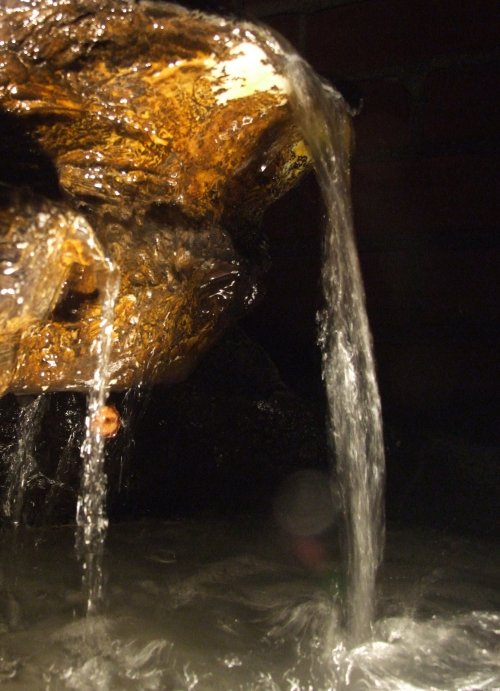 Just put in a little fountain in the front yard. It has a little light that sits in the water and is aimed towards the falling water. It looks like a little rock lined pond with a waterfall. I think it's fiberglass! Took a shot of the water falling over the rocks.