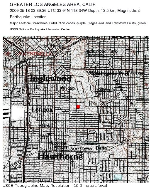 So, I'm sitting here playing Mafia Wars, Vampire Wars and half watching King of the Hill, when I hear a rumbling noise from outside. Sonic boom? Then the house starts to shake. At the same time, there was a *boom*! It felt like a truck hit the house. It rattled it pretty good. Objects fell. We haven't had things fall during earthquakes since the 1994 Northridge quake. Find out later, it was a 5.0. Decent enough. The epicenter was only a couple of miles from here. We were right on top of it.