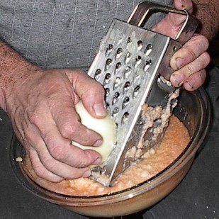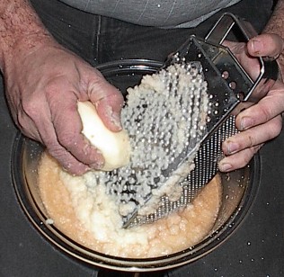 five I use about six pounds of potatoes.Peel and grate the potatoes into a bowl using a circular motion on the grater, pressing down with considerable force (six-eight pounds.) Do not grate knuckles, fingertips, etc.. |