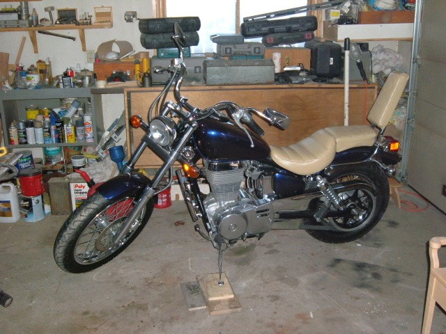 1986 Suzuki Savage: Engine and bike completely rebuilt from the frame up and painted with red/blue camelion paint. Cylinder bored out 3mm (.120") oversize and Wiseco piston kit installed.All new crankcase bearings installed, head completely rebuilt along with new timing chain, valve guides, valves, rocker arms and shafts etc. Completely drilled out and modified stock air box to receive 3.5"dia.x 5"long cylindrical K&N filter directly attached to existing rubber sleeve from the carb, installed new R&D tuneable spiral free-flow muffler, completely rebuilt carb - new diaphragm, needle jet, jet needle etc., went up two sizes for the pilot jet and pilot air jet- went up six sizes for the main jet. Engine has yet to be broken in properly for the first 1000 miles (managed to get 120 miles on it before the snow flew). Runs beautiful, but I still have one more area to deal with, the clutch, the increased power and torque is such that the stock clutch cannot handle it, I am getting slippage, especially at higher rpm's. I am looking into a Barnett clutch kit which incorporates 20% heavier springs and kevlar friction plates, meanwhile I have added .0625" thk. washers in front of a new set of OEM springs on my existing clutch to get more pressure, Won't know how this works until the snow is gone!