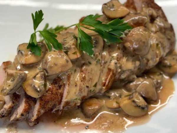 - slice pork, onto plate, sauce over the pork, potatoes on the side