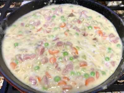 - add ham, cream, seasonings, simmer for 10 minutes