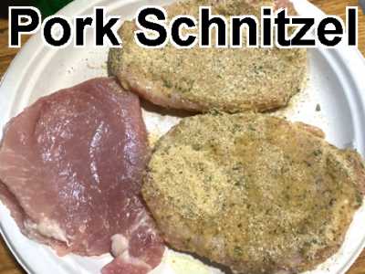 - flatten pork, coat w/ flour, dip in egg, dip in crumbs