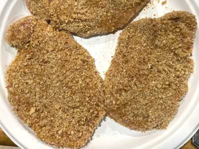 - flatten pork, coat w/ flour, dip in egg, dip in crumbs